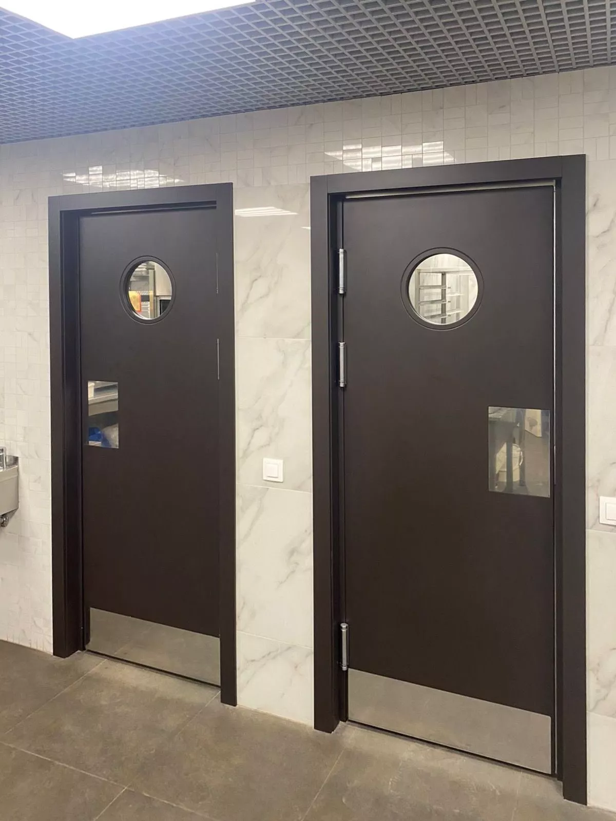 • Гигиеничность и влагостойкость Поверхность дверей должна быть устойчива к агрессивным дезинфицирующим средствам, включая хлорные и спиртовые растворы. Часто применяются покрытия, которые легко моются и не повреждаются при обработке.